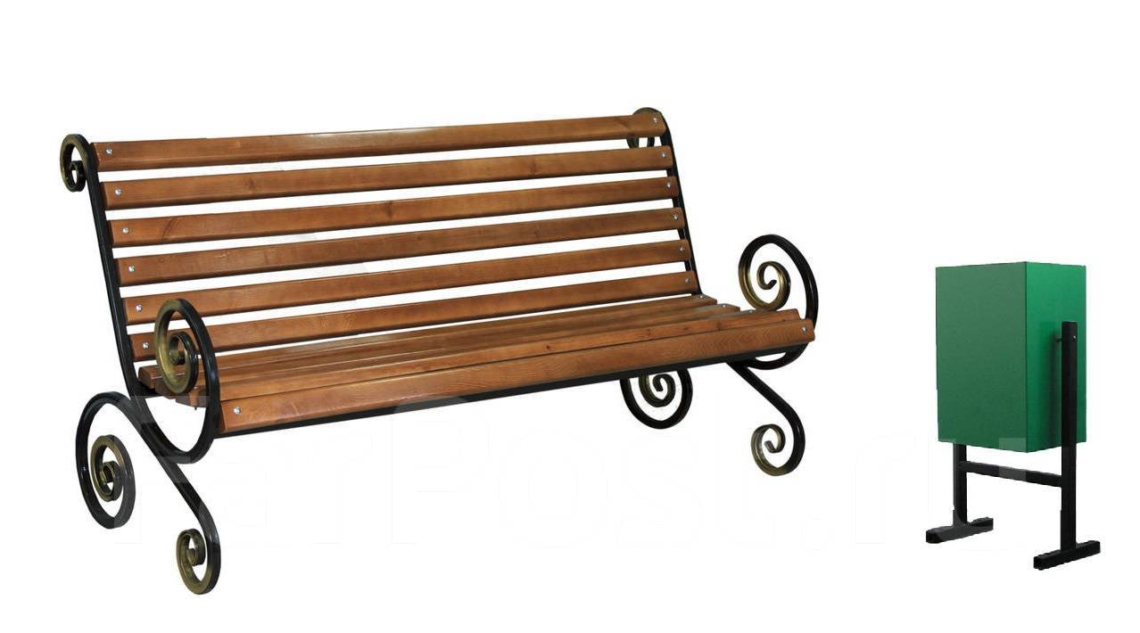 В комплект входит скамейка "Французская лоза малый вензель." и Урна уличная стандартная УУ-1 зеленая. Скамейка со спинкой выполнена из металлического каркаса и деревянных реек, предназначена для трех человек.